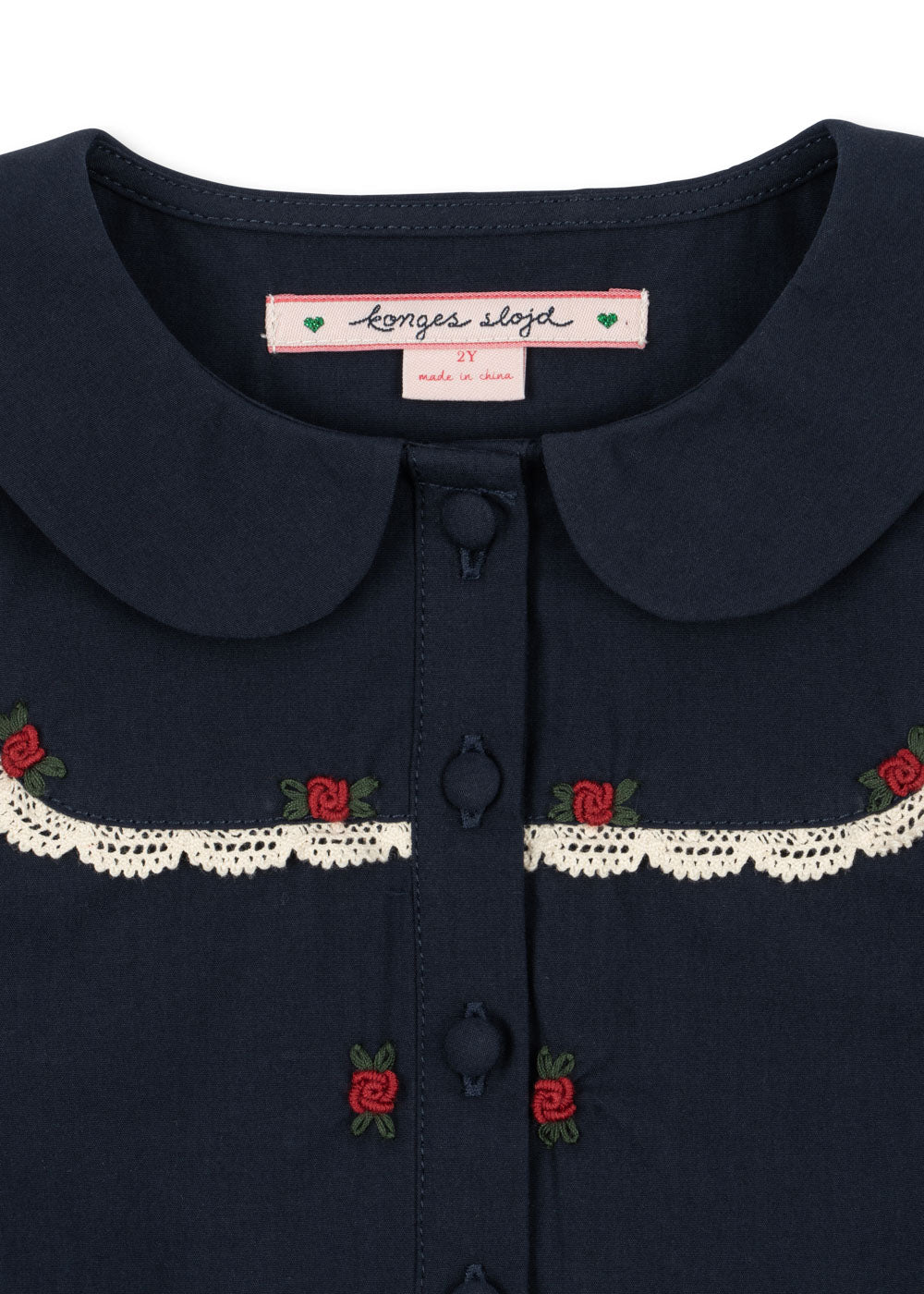 Woven cotton dress with beautiful detailing. Designed with a rounded collar, lace trim, and fabric covered buttons. The Emmy dress has slim cuffs with gatherings and a flared skirt. Made from 100% organic cotton GOTS, Organic, certified by CU1094701