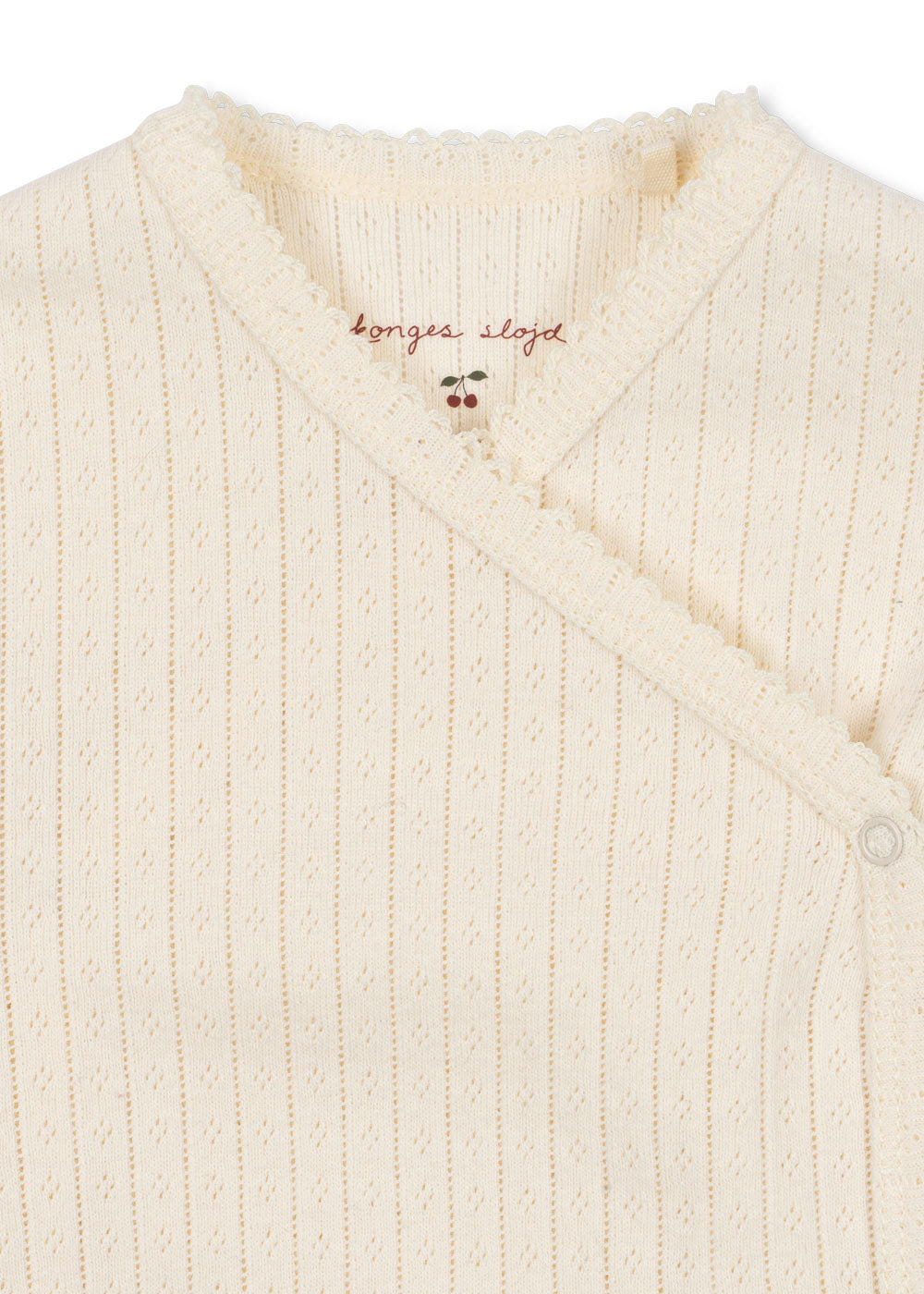 Soft body with decorative pointelle and easy wrap closure. Snap buttons along the side of the body and crotch for easy dressing. Minnie is our line of classic basic essentials crafted from soft organic cotton. These essentials are made to be worn both day and night as a comfortable layer close to the skin. Material: 100% organic cotton GOTS, Organic, certified by CU1094701
